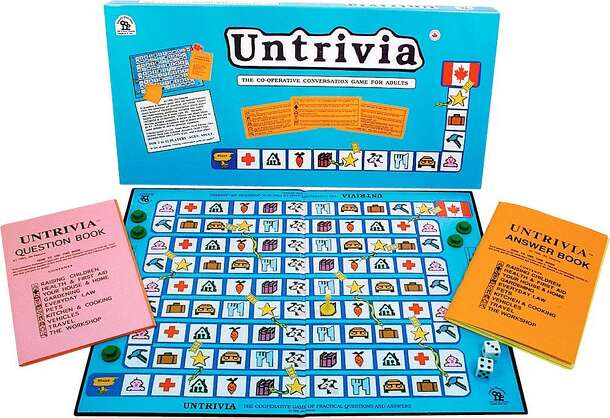 From the box: A question and answer game with two special features. First, the questions are practical, not trivial. Expect many hours of enjoyable conversation about topics such as Child-rearing, Gardening, Everyday Law, Travel, Health, Cooking, Car & Home Care, etc. Secondly, UNTRIVIA is co-operative. Players share ideas, discuss the possible answers &...