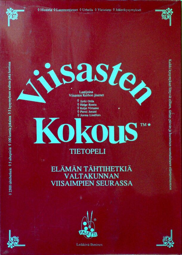"A trivia quiz for the young and young at heart" Designed by the same core team of Otila & Lindfors, this is a sort of companion game to Viisasten Kokous, but supposedly aimed at the younger crowd; which in this case means that this is a trivia game on the same general level of difficulty as Trivial Pursuit etc., compared to Viisasten Kokous which is...
