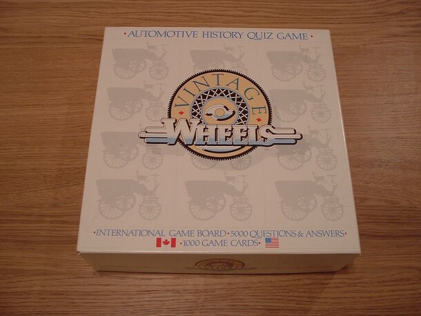 Vintage Wheels is a trivia game about automotive history. The game includes a game board, 1000 cards with questions and answers, 6 tokens, a die and instructions. Each player rolls the die on his turn to determine which question an opponent will ask him from a card. A correct answer allows the player to advance his token along a track the number of spaces...