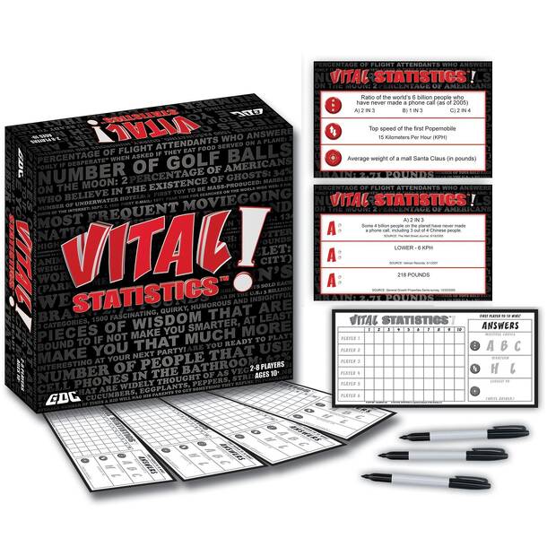 Back of the box: This game of humorous, fascinating, quirky and insightful tidbits offers knowledge on everything from sports and fashion to literature and architecture and everything in between. Packed with an enormous array of factoids, minutiae and random bits of wisdom, Vital Statistics is perfect for both knowledge hounds and pop culture fiends alike....