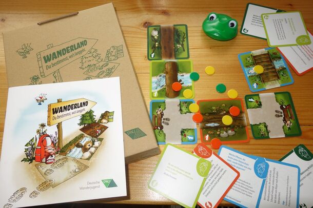 A trivia game produced by "Deutsche Wanderjugend", a German hiking organisation for young people. The game consists of 360 cards, a frog clicker and 50 chits. The cards are used to build a one-meter long path. The card backs have path segments, bridges and turns printed on them. In order to be allowed to add a card to the path, one has to complete a task...