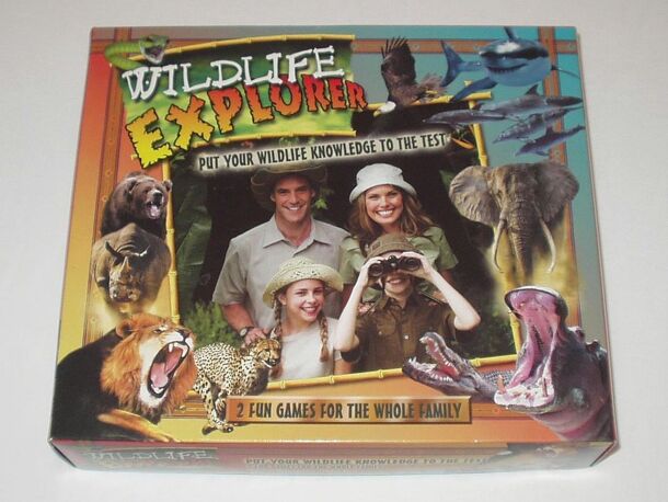 "Put your wildlife knowledge to the test!" Players move plastic explorers around a colorful map featuring jungle, desert, and mountain terrain as they answer questions about wildlife. The categories on the question cards include Environment, Predator, and Animal Challenge. There are two levels of play for children and adults. Includes the board, six high...