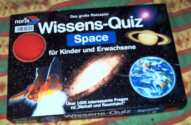 The players have to collect 8 knowledge chips of every color. The chips are rewarded for answering one of 1000 questions out of different fields of 'space' knowledge (Planets, space travel..). During player's turn die is rolled; he/she may move into any direction, but not vice versa; occupied spaces may be crossed. Appropriate card is drawn, die is used to...