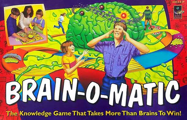 Brain-O-Matic is a trivia game. Players answer questions to get to roll and move their piece along the board track. On most spaces they must press the button on the "brain". The brain makes sounds and cycles lights through the six categories until it settles on one. The player must answer a question from this category. There are three questions on each...