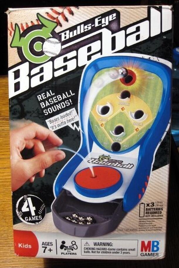 A tabletop baseball dexterity game. Players bounce balls off a mini-trampoline and try to get them in the target holes to get runners on base and score runs. An electronic announcer keeps score. There are 4 game modes: Half-Inning Rally - Score as many runs as possible before 3 outs. 30-Second At Bat - Score as many runs as possible in 30 seconds. Home Run...