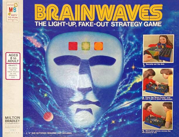 Brainwaves a two-player abstract, fairly simple in concept. Basically, it's a grid, and you've got 3 pieces on your side, and the other player has three pieces on their side. To win, you have to move two of your pieces onto the other side. Your pieces are all the same shape, in red, yellow, and green. You roll a die, and then get to move one of your pieces...
