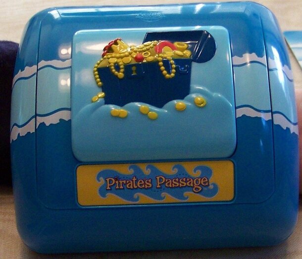 Square cards are used to create a layout of paths through a square "ocean" with the box (which is also the goal square of the game) at the center. The players' home islands/ starting squares are at the corners. The game's box is a molded plastic affair containing a voice chip; in turn, players push a button on top to hear a pirate voice give commands such...
