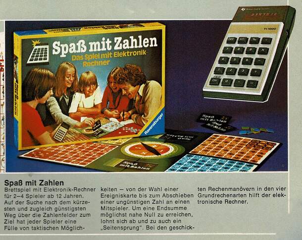 The game with "Elektronikrechner" - electronic calculator. From the publishers description: Goal: Who can build first an uninterrupted row of tokens on the game board, from start to finish? Who has at the same time brought his end sum by clever choosing numbers near Zero, so he wins the game. Some tactics for an even more suspenseful game: Instead of cool...