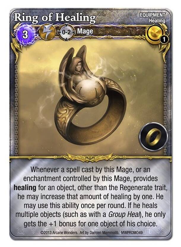 This promo card was given at Gen Con 2013. Ring of Healing Whenever a spell cast by this Mage, or an enchantment controlled by this Mage, provides healing for an object, other than the Regenerate trait, he may increase that amount of healing by one. He may use this ability once per round. If he heals multiple object (such as with a Group Heal), he only...