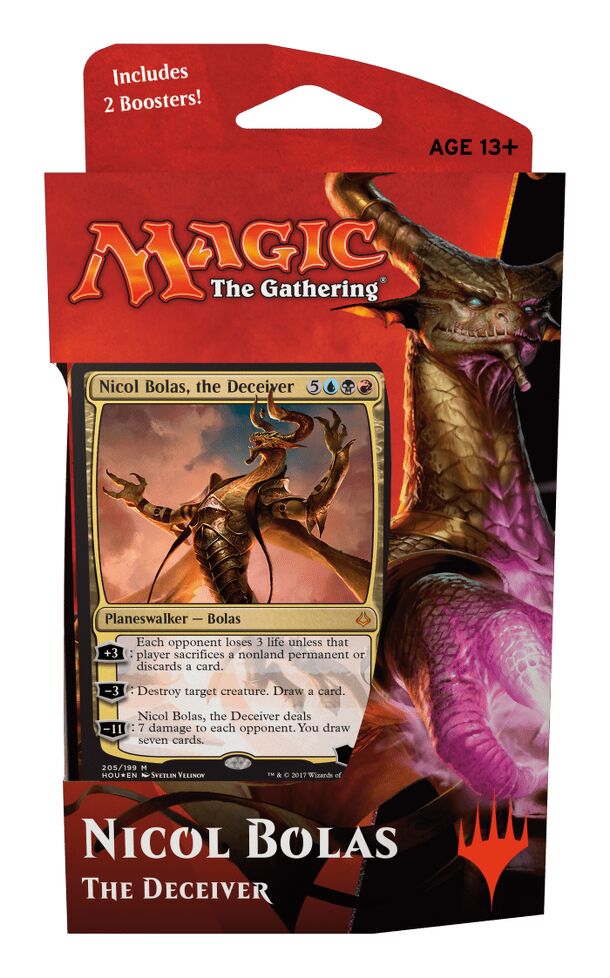 Planeswalker Decks familiarize players who are interested in Magic with basic strategy, plus the games setting, characters, and mechanics of the latest set. Each deck comes with a foil Planeswalker card not found anywhere else. Ancient and powerful, the dragon Planeswalker Nicol Bolas will stop at nothing to dominate the Multiverse. Join his cause to raise...