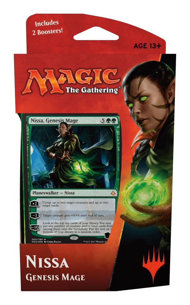 Planeswalker Decks familiarize players who are interested in Magic with basic strategy, plus the games setting, characters, and mechanics of the latest set. Each deck comes with a foil Planeswalker card not found anywhere else. The elf Planeswalker Nissa Revane draws power from her connection to the natural world. Enlist her aid to harness primal elemental...