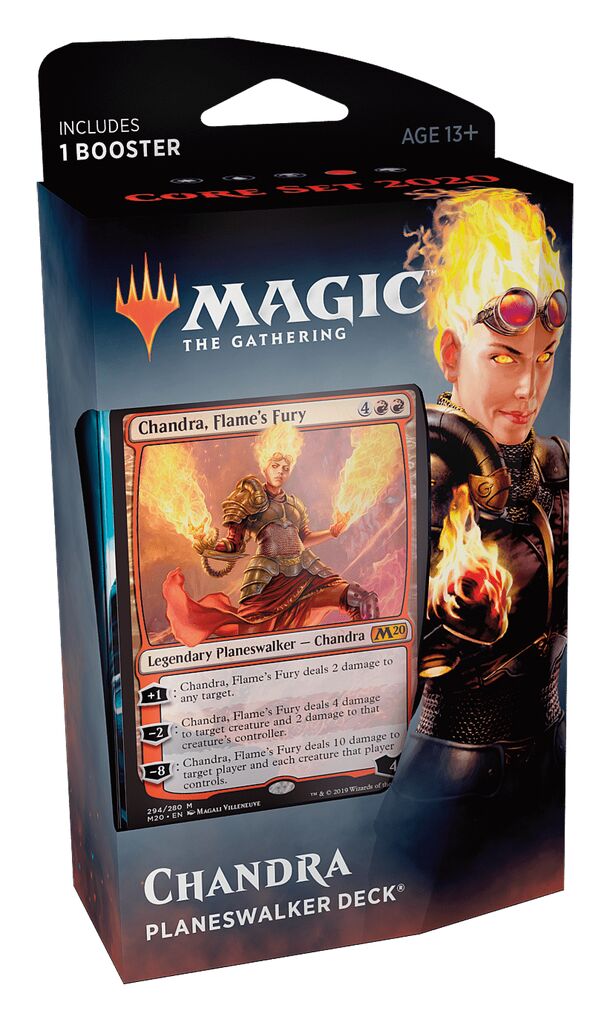Planeswalker Decks familiarize players who are interested in Magic with basic strategy, plus the games setting, characters, and mechanics of the latest set. Each deck comes with a foil Planeswalker card not found anywhere else. Powerful, passionate, possessing a short fuse, Chandra is always ready to bring the heat. Launch a burning barrage directly at...