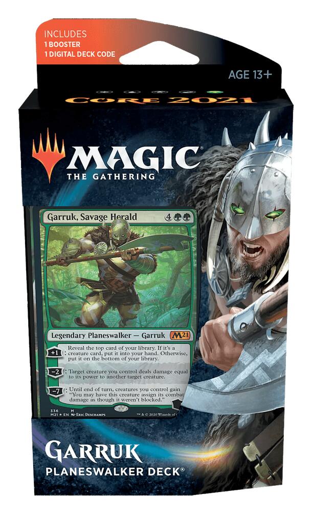 Planeswalker Decks familiarize players who are interested in Magic with basic strategy, plus the games setting, characters, and mechanics of the latest set. Each deck comes with a foil Planeswalker card not found anywhere else. Cursed no longer, Garruk is free to stalk the multiverse for the prey of his choosing. Overrun your opponent with a ceaseless...