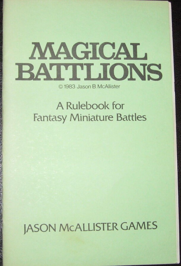 From the introductions: MAGICAL BATTLIONS [sic] is a rule system for fantasy miniature battles. It assigns figures factors by a process of measurement and judgment to reflect the capabilities depicted by the pieces themselves. Figures are moved as individuals; no special stands or formations are required. Play takes place on boards comprised of hexagons or...