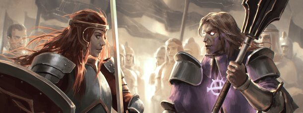 In this lightweight fantasy game you get a random race (elf/undead/human/orc or demon) and a random saga (fight/duel/treasure/mist/crown). The races all have a leader and 3-4 soldiers. Elf, undead and human have 1 character with a ranged attack. Each saga has a different goal. Fight saga is a battle between all characters. Duel is just the leaders fighting...