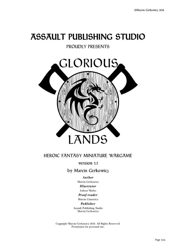Glorious Lands is fast-paced generic fantasy miniature wargame, where you can command a band of a few dozens of warriors, supported by heroes, monsters and deadly war machines. The 64-page-large rulebook consists of every rule which is needed to play the good game in most of fantasy settings – core rules, magic, scenario generator and a lot of army lists....