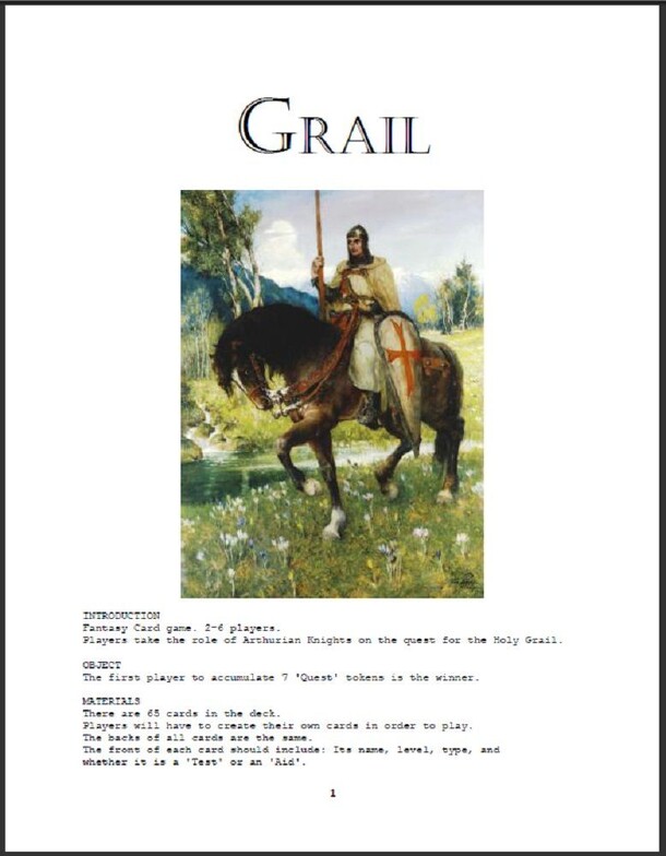 “Fantasy Card game. 2-6 players. Players take the role of Arthurian Knights on the quest for the Holy Grail. Object: The first player to accumulate 7 'Quest' tokens is the winner.” “Materials: There are 65 cards in the deck. Players will have to create their own cards in order to play. A six sided die is required to play. 7 'quest tokens' per player are...