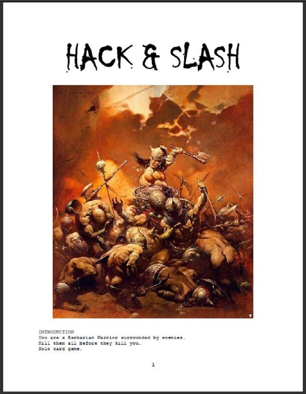 "You are a Barbarian Warrior surrounded by enemies. Kill them all before they kill you. Solo card game." The game is played using a custom deck of cards. There are three kinds of cards in the deck - Attacker, Defense, and Kill Cards. Each turn the player chooses to draw one to three cards. Defense and Kill cards are kept in the player's hand (up to a...