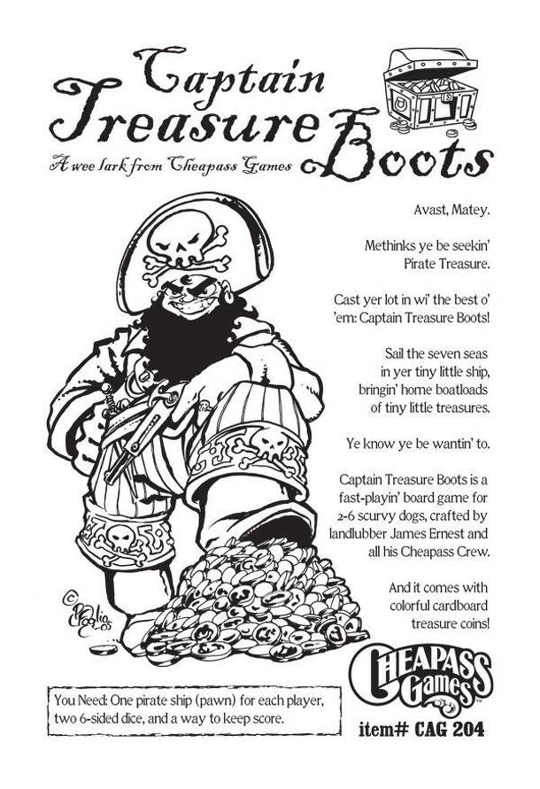 Game description from the publisher: Captain Treasure Boots is a fast-playing pirate-themed board game. Players gather treasure from islands around the board, and bring the treasure home to port. Treasures are worth points, but they also give you special abilities, so you'll have to decide how much to keep, and how much to cash in. Of course, treasure is...