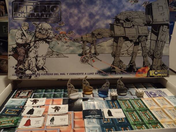 Spanish boardgame with the theme of The Empire Strikes Back. A board 'Maze' that has four major zones that contain threat cards in rooms of the maze. Each threat has a minimum that must be rolled to defeat it. By defeating threats players collect points. Once a minimum of 20,000 points are accumulated the player must face Darth Vader. Some cards have...