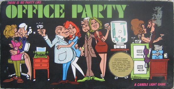 From box: "America's newest and most exciting party game. With this game all players really get down to the nitty gritty. Makes a great gift! (Any number can play)" "The object of OFFICE PARTY is to have a rollicking good time. This will be achieved by drinking, stripping, winning chips, and indulging in general hanky panky." The game consists of a board...