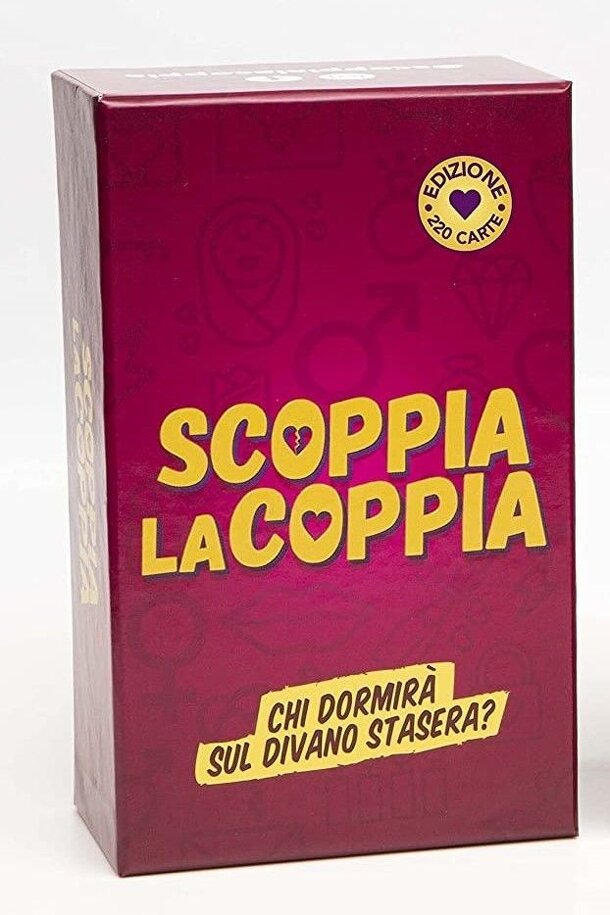 Scoppia la coppia ("Clash of Couples") is already the must-have couples game to test your knowledge of your partner with questions about everyday life, personality traits and your intimacy… Each turn, vote for the situation that suits you best and find out how well your partner knows you… or not! So, who will sleep on the sofa tonight? Rules: "Just the two...