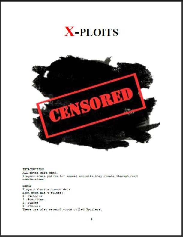 "XXX rated card game. Players score points for sexual exploits they create through card combinations." The game uses a custom deck of over 100 cards which are named for Partners, Places, Positions, Pluses, and Spoilers. The players draw and discard from a hand of seven cards attempting to play a combination of as many cards as possible. Each combination...