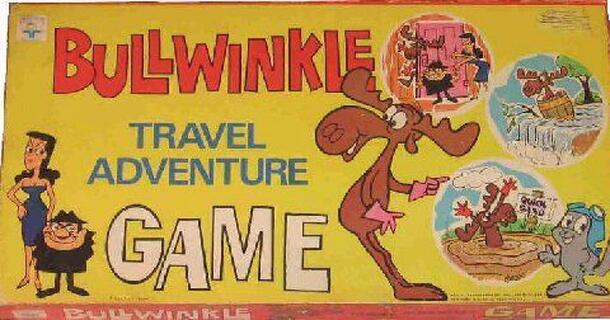 [From the box] "And now here's something you'll really like!" "Join the fun at Frostbite Falls and Wossamotta U. with Bullwinkle, Rocky and all their pals! The Bullwinkle and Rocky game lets you play the role of your favorite character - from Dudley Do-Right and Mr. Peabody to Boris Badenov and Snidely Whiplash! Easy to learn, the Bullwinkle and Rocky game...
