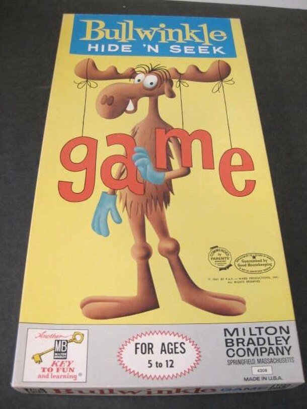 A Bullwinkle themed boardgame variant on hide-n-seek. (Bullwinkle is a fictional moose character from the 1959-1964 animated television series Rocky and His Friends and The Bullwinkle Show.) Theme Players play a hide-and-seek game with Bullwinkle and his friends. Goal Scoring the most points by finding picture chips which have been hidden on the balloon...
