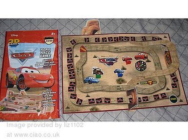 A "3D" board game distributed in a bag with jelly beans for fuel. Promotional item for the Disney/Pixar film, "Cars", with two circular tracks linked with a flyover section of track to permit moving from the outer to the inner track. Movement is determined by an ineffectual 6 sided spinner rather than a dice. Cards are randomly placed on the spaces and...