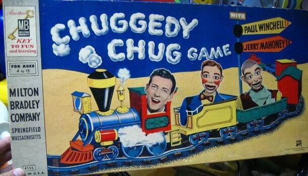 A simple train game for children in which a player spins a spinner and then moves his train down a track. Special spaces on the track can force the child to blow his whistle or to lose a turn, possible destroying a deeply developed strategy. The game is significant for its theme. Pictured prominently on the box is the ventriloquist Paul Winchell and two of...