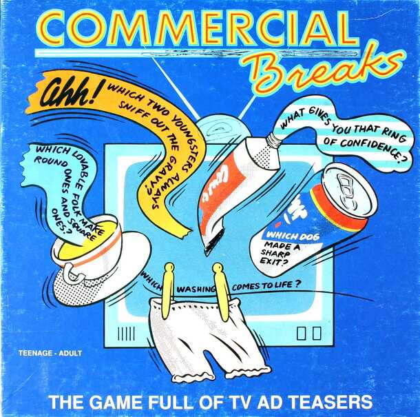 COMMERCIAL BREAKS - The game Full of TV Ad Teasers. From the box: "Test your knowledge of (UK) TV ads with 1000 crazy crazy questions featuring commercials both old and new - love 'em or hate 'em but can you remember them? You'll have great fun finding out. Collect 'category cards' by racing around the board, answering the teasing, quirky questions from...