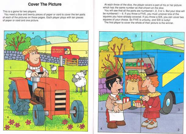 Game featured in the Postman Pat Annual for 1994. Simple game for pre-school children. Each player uses one of the two pictures. The pictures are divided in to 10 oblong segments. These are numbered from one to four. In a turn, the player rolls the die and if he rolls a 1, 2, 3, or 4, he covers one segment with that number (use a piece of card or similar...