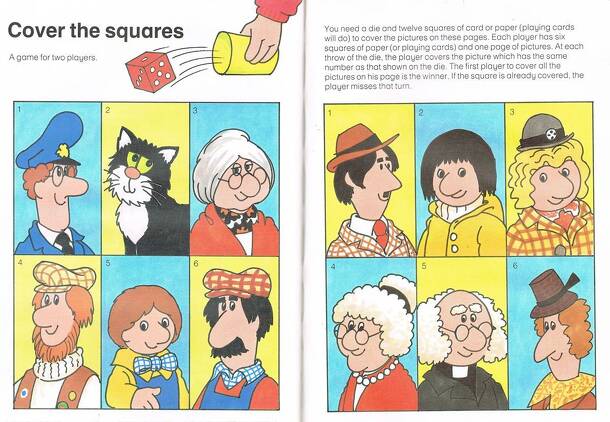 Game appeared in the Postman Pat Annual for 1993. Two players are required. Each gets a picture board featuring 6 characters from the Postman Pat stories. In your turn, roll a die. Using playing cards as 'markers', you cover the picture that matches your roll on the die. If you roll the same number twice, you miss a turn. First to cover all six characters...