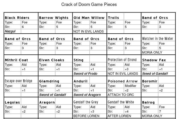 “Lord of the Rings Theme. Each player is their own 'Fellowship'. Victory: Players race to see who is the first to destroy the One Ring.” The game is played on a track 72 spaces long. Designated spaces on the track represent the Shire, Moria, Mordor, Mount Doom, and other Middle Earth locations. Play Foe and Harship Cards on your opponents to hinder their...