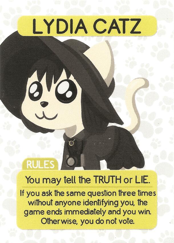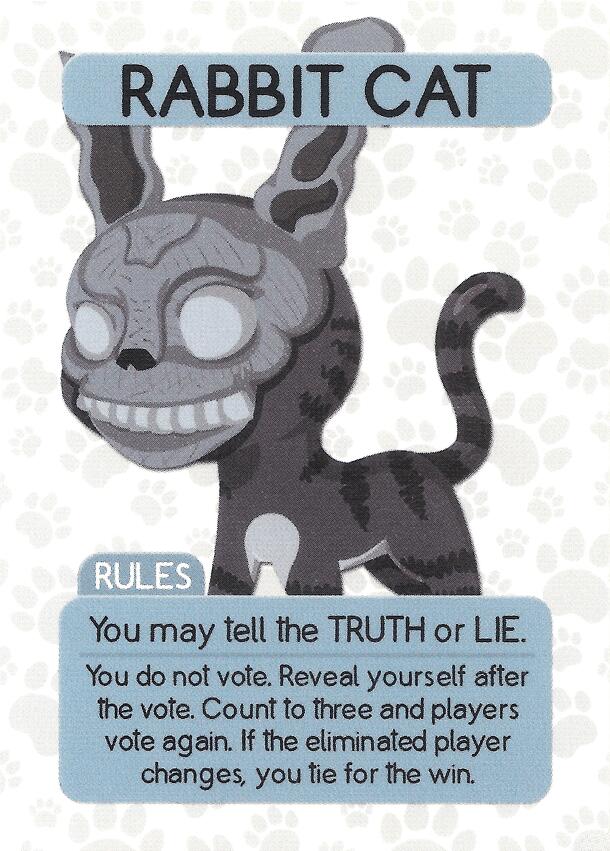 A new character for Wild Cats, Rabbit Cat, delivered in Board Game of the Month Club October 2016 package, inspired on the cult film Donnie Darko. Sticking with the theme, but bringing in the tangential universe, we have a Rabbit/Cat that makes players take back their votes and vote again. RULES You may tell the TRUTH or LIE. You do not vote. Reveal...