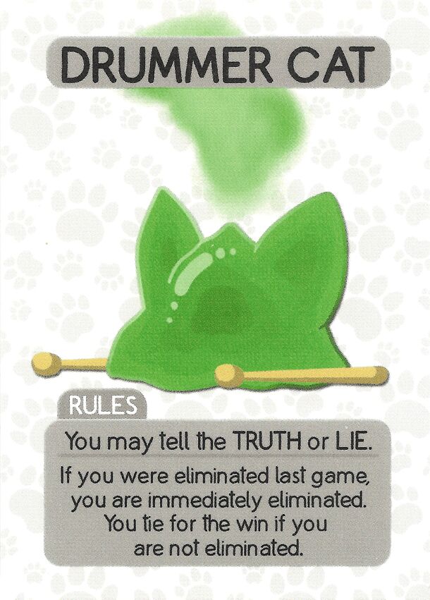 A new character for Wild Cats, Drummer Cat, delivered in Board Game of the Month Club November 2016 package, inspired on the cult film This Is Spinal Tap. We wanted to have fun and feel the effects of spontaneous combustion. So of you lost last round, lose again. RULES You may tell the TRUTH or LIE. If you were eliminited last game, you are immediately...