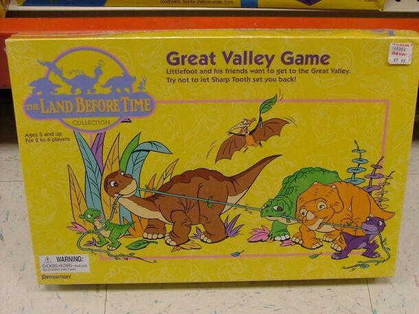 The Land Before Time gang is on an adventure, and you're invited to join them! Littlefoot, Spike, Cera, Petrie and Ducky are all trying to get home, but they need you to help. Spin the spinner and draw cards to move them along. Be the first to get the gang back to Great Valley and you win. But watch out: Sharp Tooth is not far behind, and sometimes he...