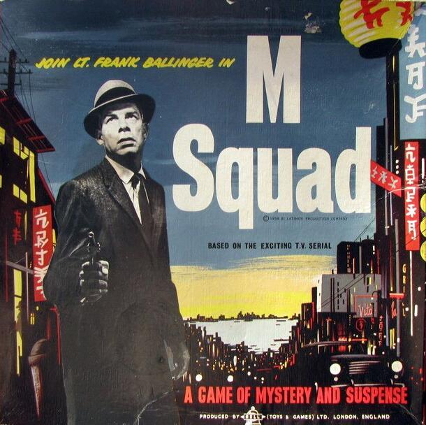 M Squad is a roll-and-move game featuring the famous TV-series of the late 50ies/early 60ies with male actor Lee Marvin starring and depicted on the box cover. It's a light family game using the box inlay as game board. You have to travel the town with small plastic cars in order to locate the daughter of a famous citizen who became a victim of a criminal...