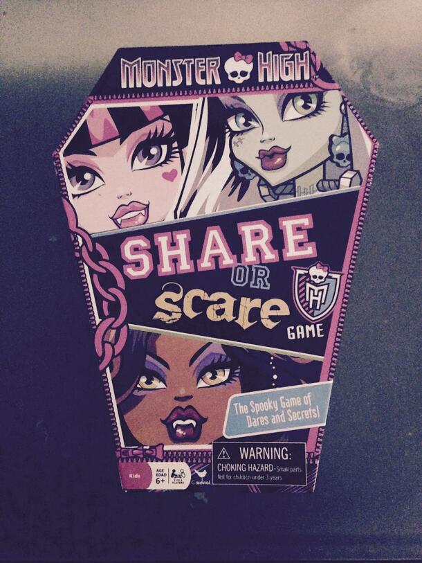 From the box cover: Grab your ghoul-friends for a fang-tastic game of truth or dare! On your turn, spin the spinner to see your fate...Spin Share and you'll reveal your spookiest secrets, monstrous crushes, and all the stuff that makes you eerily unique...try to guess each others' answers to score! Spin Scare and beware! You'll do one of a hundred...
