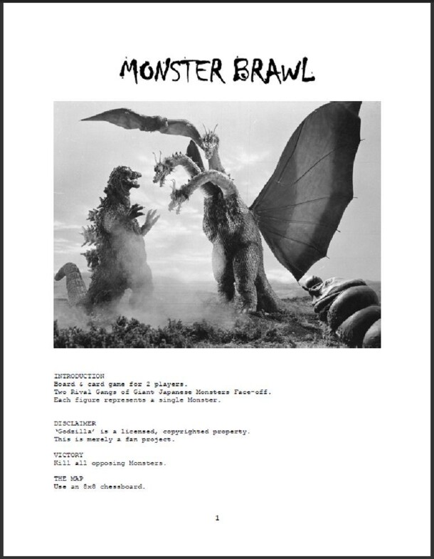 "Board & card game for 2 players. Two Rival Gangs of Giant Japanese Monsters Face-off. Each figure represents a single Monster. Victory: Kill all opposing Monsters." The game is played on a chessboard or any other 8x8 grid. Action figures, toys, miniatures, or counters are used to represent the monsters. The players each have forty points to spend on...