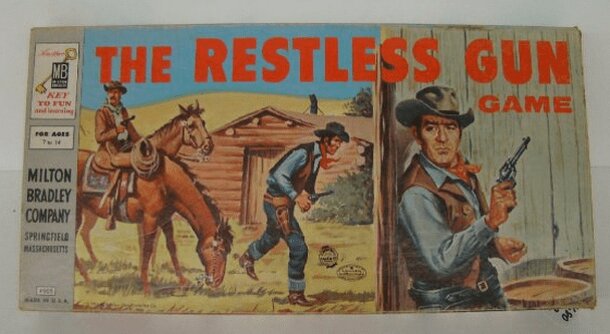 Based on the 1957-1959 TV Western of the same name, this is spin-and-move game using coloured marbles as placeholders. The board uses cut-out divots to hold the marbles, and two spinners are built into the board itself. Players move their marbles around the board in a manner vaguely reminiscent of "Parchesi" or "Sorry". Specific areas on the board and the...