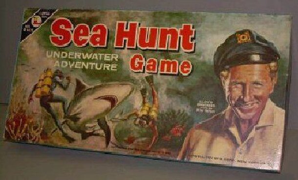 Sea Hunt Underwater Adventure Game is based on an old TV show from the late 1950's and early 1960's called "Sea Hunt" that starred Lloyd Bridges as Mike Nelson a skin diver. This game was made by Lowell Toy MFG. Corp., New York 56, N.Y. The copyright is listed as 1961 Ziv-United Artists, Inc. This is a spin and move game. The object of the game is to...