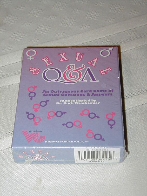 Published by Avalon Hill's Victory Games. Here's the information from the box: Front: Sexual Q&A - An Outrageous Card game of Sexual Questions and Answers. Authenticated by Dr. Ruth Westheimer. Back: This is a provocative sex-oriented card game for 2 or more players of consenting age. The object is to correctly answer situations provided in a true or false...
