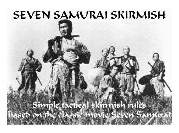 "Simple tactical skirmish rules. Based on the classic movie Seven Samurai." Seven Samurai and forty villagers face off against thirty-seven heavily armed bandits. The game is played on a hex map showing the village being protected by the Samurai. The counters represent men, horses, guns, armor, and wounds. "Victory: The Bandits win if all the Samurai are...
