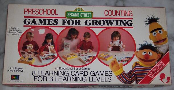 Sesame Street Preschool Games for Growing-Shopping Set "is designed to help your child learn about earning, saving, and shopping wisely." The set contains 3 Main Games and 2 Introductory Games The Introductory games introduce the board and cards to younger children. Game 1 Fun to Earn: Uses the bottom half of the Board. Players take Job Cards from the Home...