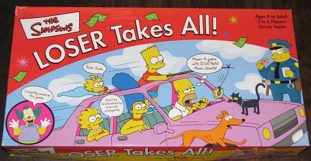 A Simpsons branded party game with a strong truth or dare flavor. The winner is the player with the lowest score at the end of the game. Players select a Simpsons character for a pawn and place it on the board. They are given $20 in fake money and 10 junk food tokens as well as the give character cards matching the pawn they selected. Players take turns...