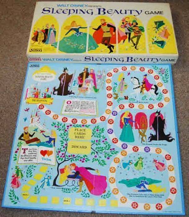 This is a Parker game, released in 1958 and linked to the animated Disney film. Each player is the Prince, who must travel along the dangerous paths in order to kiss Sleeping Beauty and awake her from her sleep. Along the way you must obtain three pictures as without these the Prince must continue along the Deep Sleep path, never reaching Sleeping Beauty....