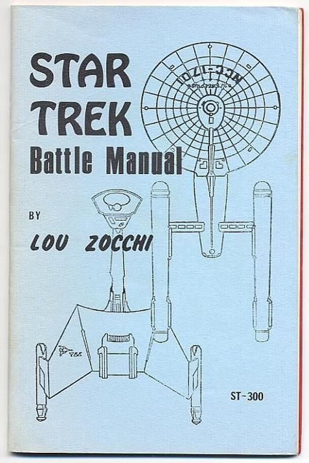 Star Trek Battle Manual was Zocchi's first foray into space combat games. It is very similar to his later Alien Space Battle Manual and Star Fleet Battle Manual, with good reason. Zocchi did not have a license to publish a Star Trek game when this came out, and in addition to the title the game uses images of ships from the series (the Enterprise is on the...