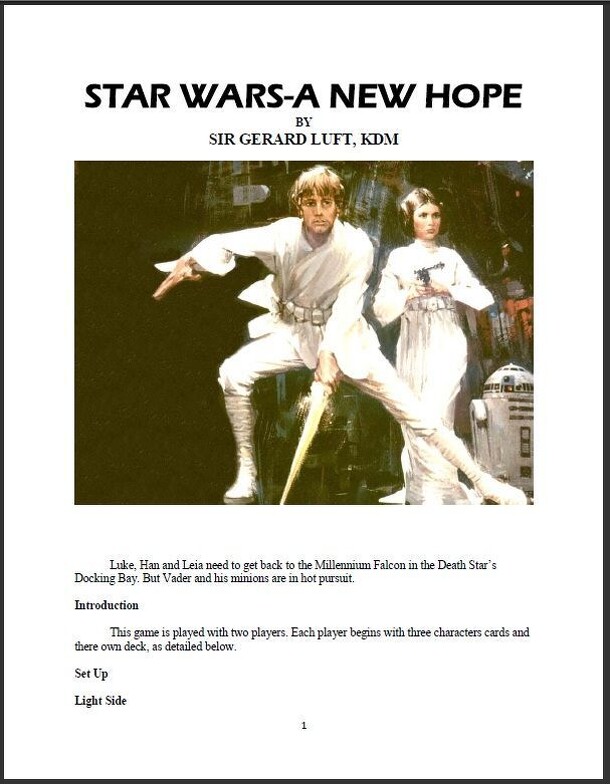 “Luke, Han and Leia need to get back to the Millennium Falcon in the Death Star’s Docking Bay. But Vader and his minions are in hot pursuit.” The game is played on the map from the Escape From the Death Star miniature game, or the players may design a custom map. The object of the game is to destroy all of your opponent’s characters. Each player controls...